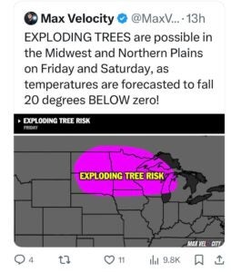 You also haven’t been imaging things if you’ve seen warnings about the potential for “exploding trees” in the Upper Midwest, where extreme cold (think negative digits) is hitting.